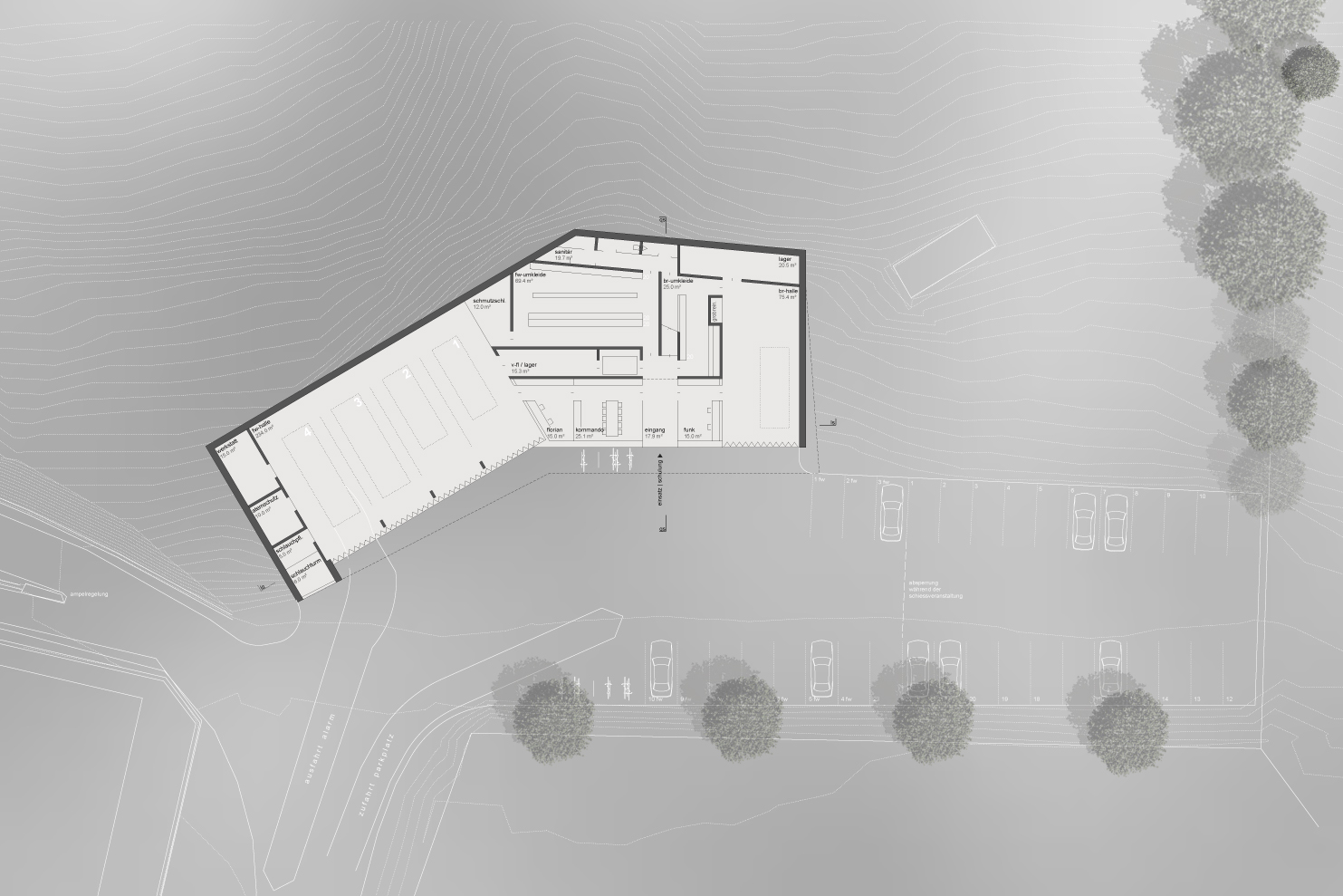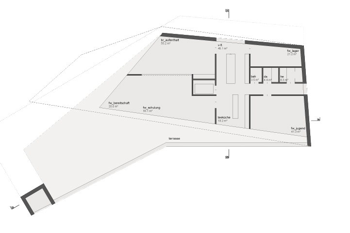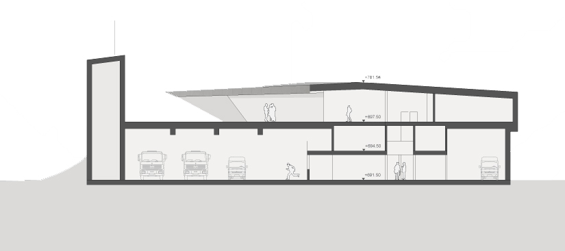 Den Höhenschichtenlinien folgend ergibt sich ein sehr dynamisch geformter Baukörper, der die Geschwindigkeit und Präsenz der Feuerwehr und Bergrettung unterstreichen soll.