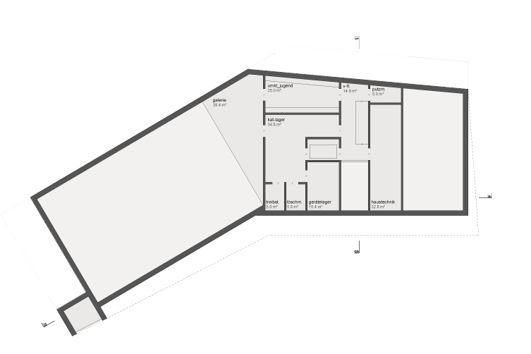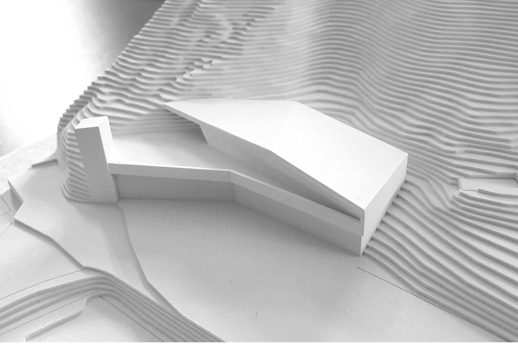 Die Architektur reagiert auf diesen Umstand. Das Gebäude nimmt die Linie der Böschungskante auf und spielt mit den sich ergebenden unterschiedlichen Tiefen zwischen der Fassade und dem Hang.